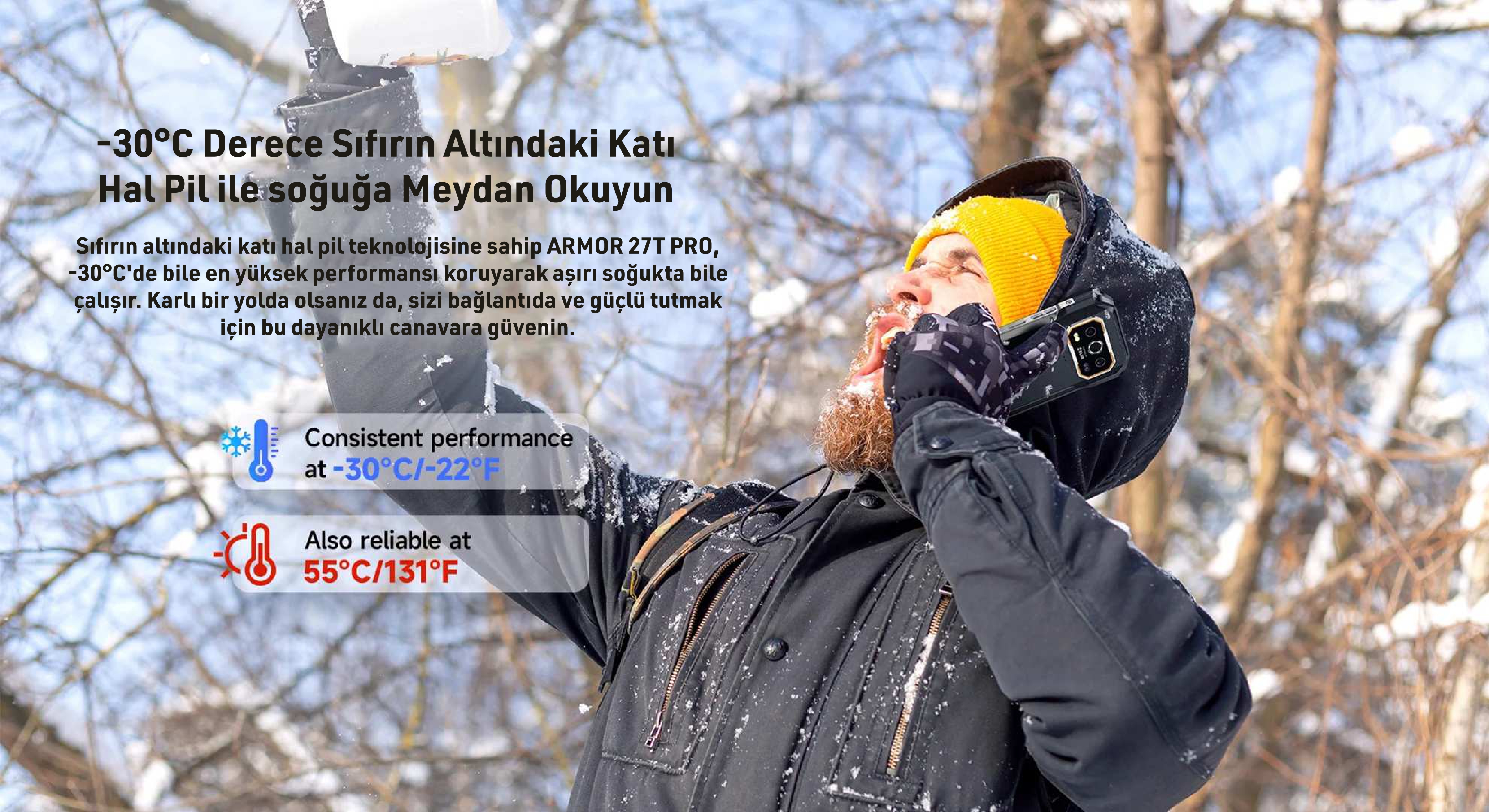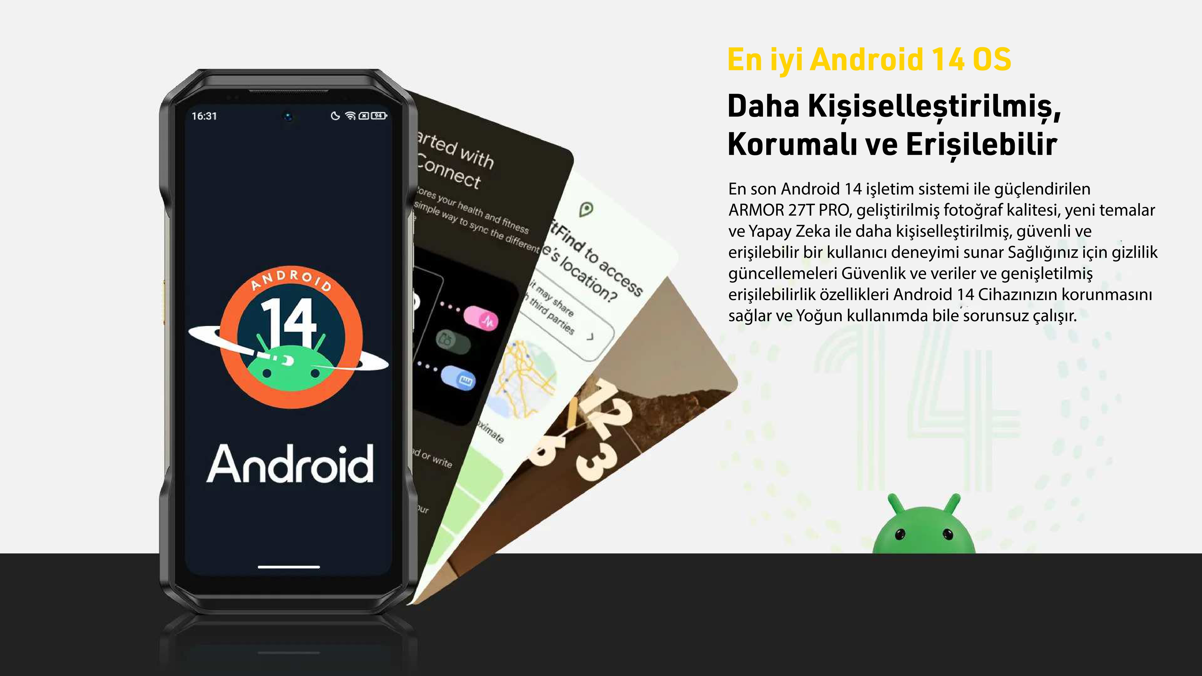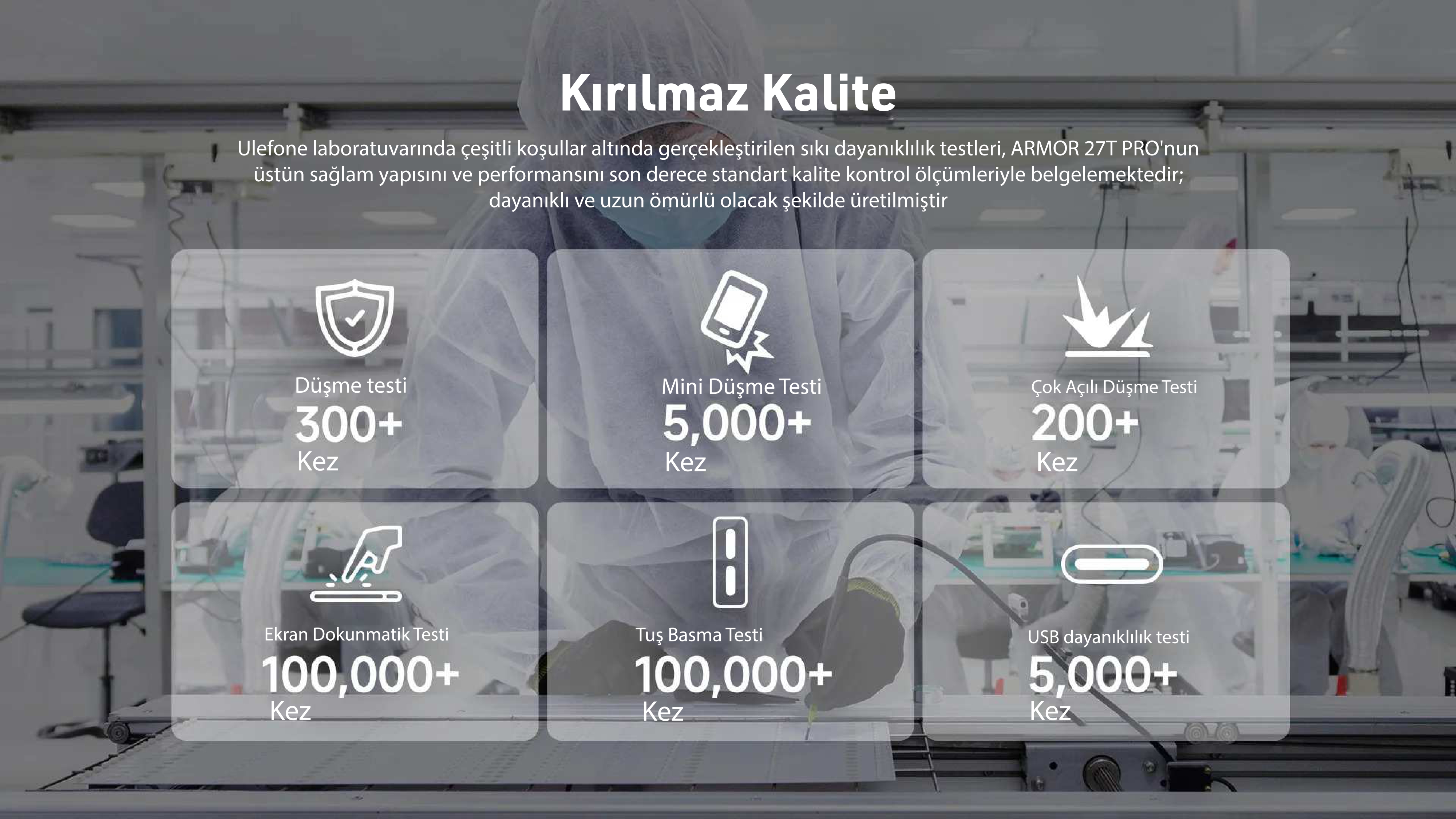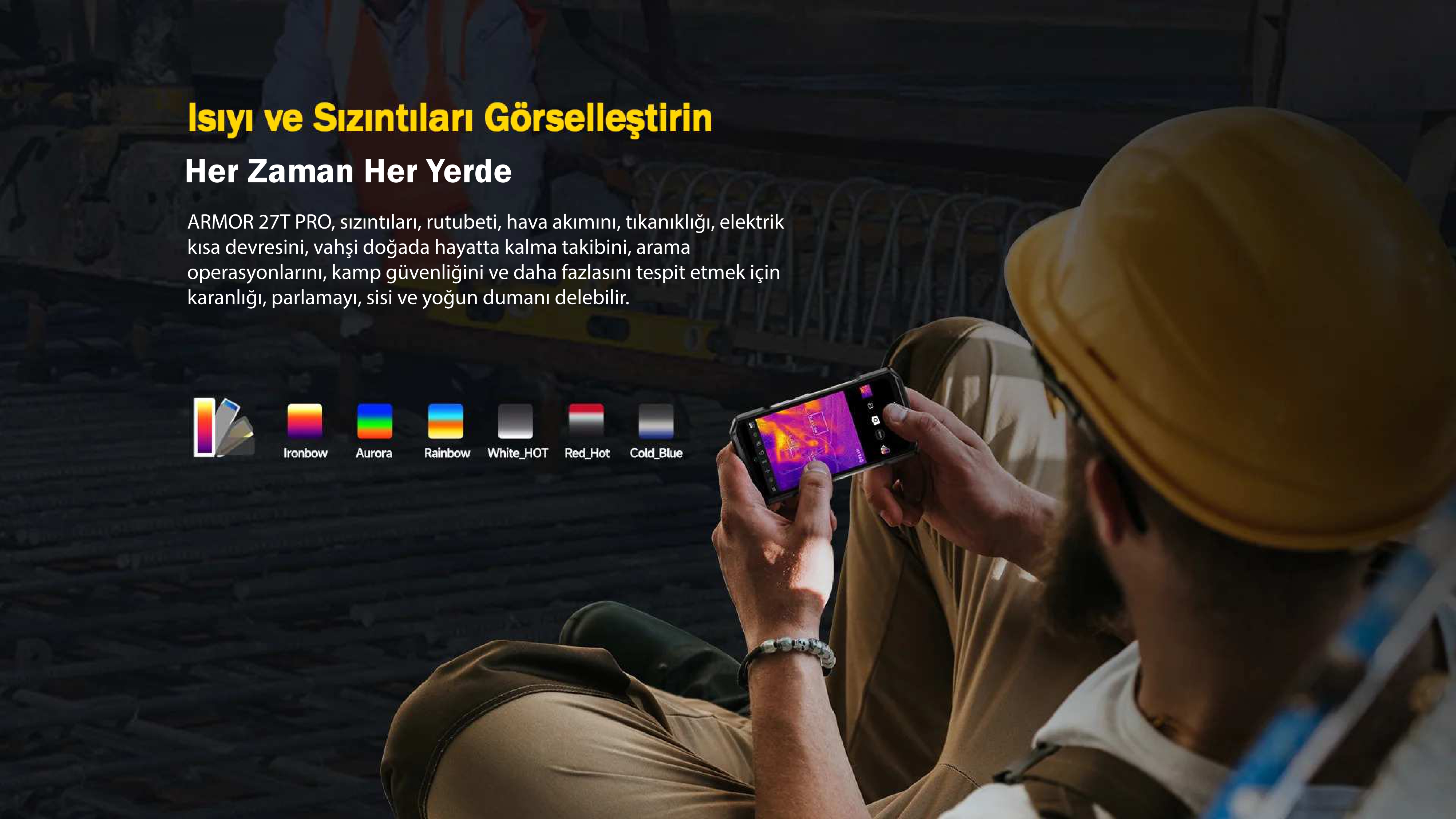 *Armor 27T Pro su sıçramasına, suya ve toza dayanıklıdır ve IEC standardı 60529 kapsamında IP68 derecesi ile kontrollü laboratuvar koşullarında test edilmiştir (maksimum 2,0 metreden 30 dakikaya kadar derinlik).