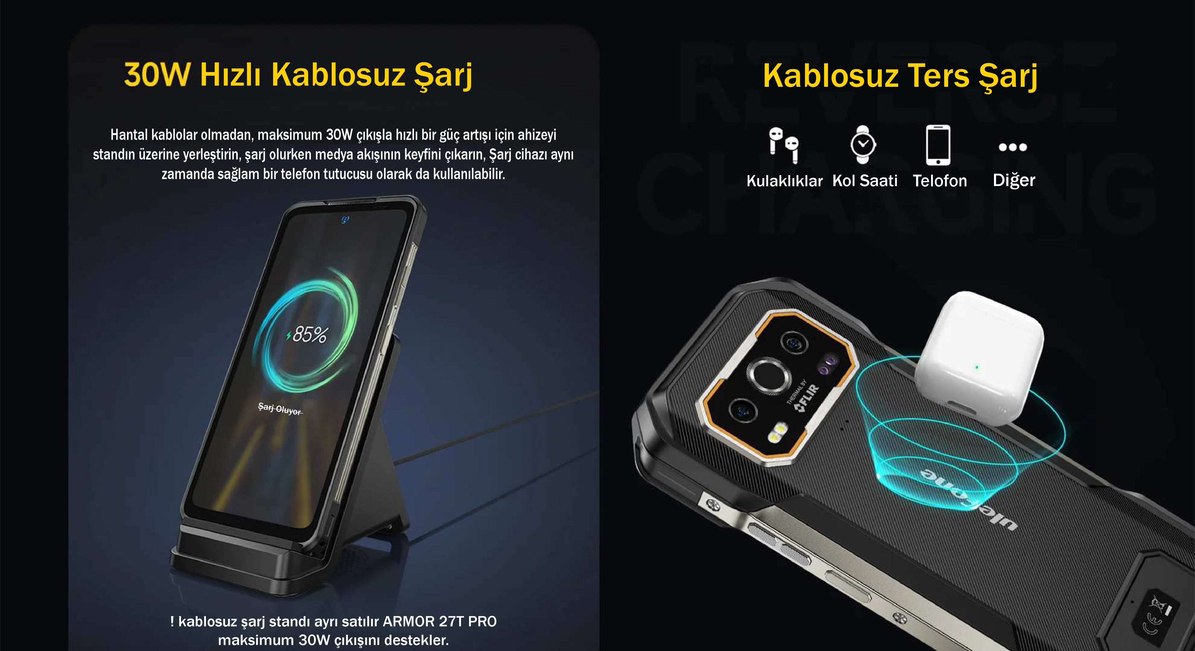 *Ulefone özel protokolü kapsamında, maksimum kablosuz şarj gücü 30W'tır ve maksimum 15W kablosuz şarjlı Qi protokolü ile de uyumludur. Gerçek şarj gücü, farklı senaryolarla akıllıca değişecektir, lütfen gerçek kullanıma bakın.
