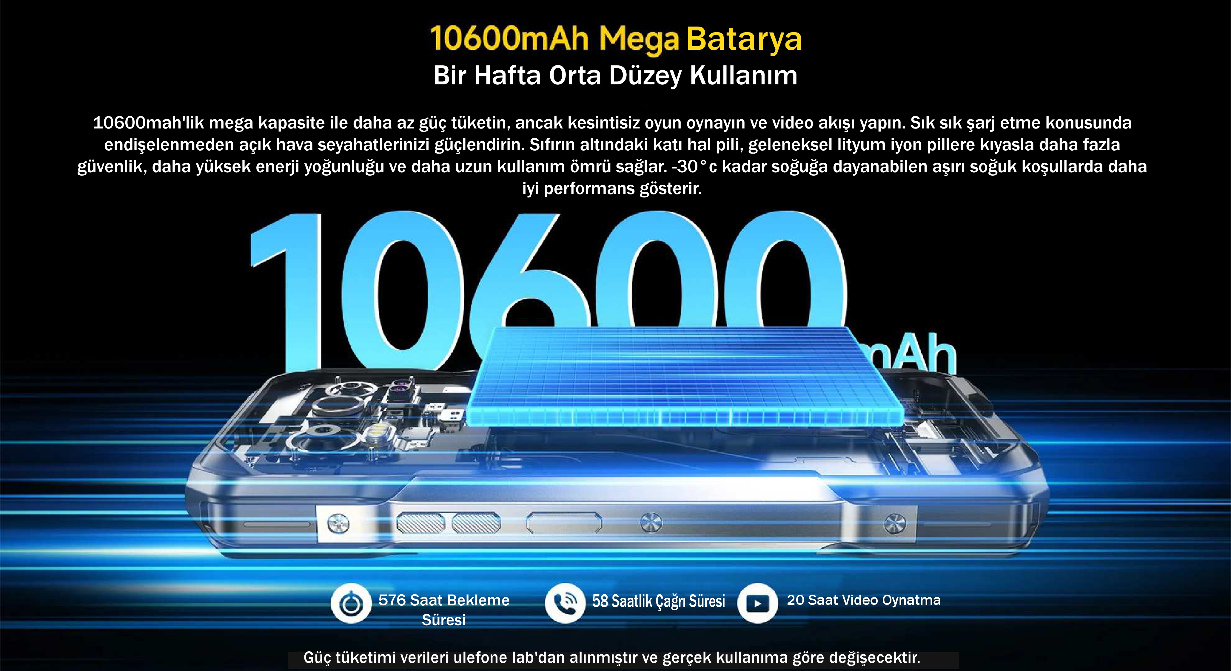 16. Pil verileri Ulefone laboratuvarından alınmıştır, gerçek performans değişebilir.
